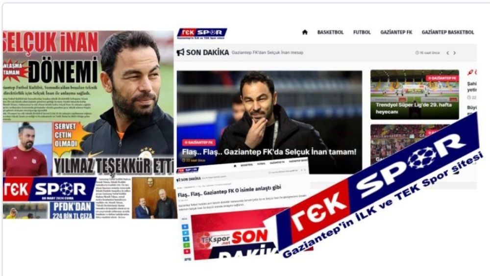 Gaziantep futbolunu ve sporunu yakından takip eden ve gerçek bilgileri okurlarıyla paylaşan Tekspor, teknik direktör transferinde yine okurlarına ilk duyuran medya oldu. Gaziantep Futbol Kulübü, Teknik Direktör Selçuk İnan ile ilk temas kurduğunu, görüşmelerin sağlandığını ve anlaşmanın yapıldığını her zaman olduğu gibi Tekspor yine öncülük ederek taraftarlara duyurmayı başardı. Gaziantep futbolu ve sporuyla ilgili tüm gerçek haberler bundan sonrada www.tekspor.net adresinde olacak.